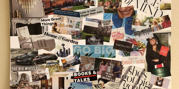 A vision board is a collage of images, pictures, and affirmations of one's dreams and desires, designed to serve as a source of inspiration and motivation, and to use the law of attraction to attain goals.